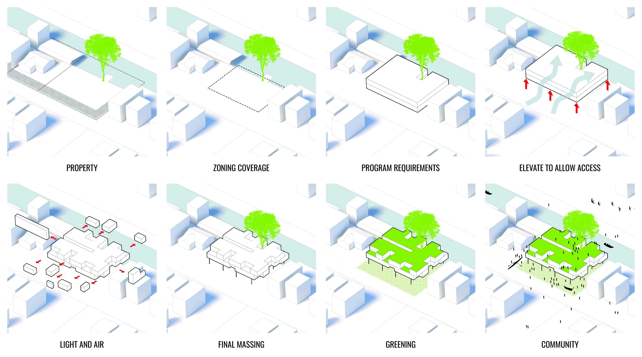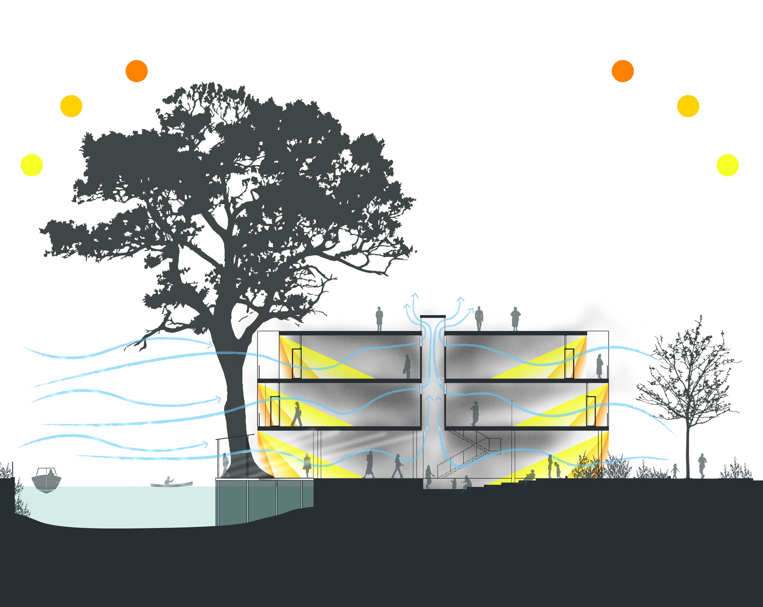 The new three story residential building promotes community engagement and amenities. Lifting the massing off of the ground creates views to the water and gives the ground plane to the public realm. This dynamic space is able to adapt to a variety of community needs, including workshops, classes and social gatherings, while small enclosed areas house vertical circulation and a space to rent watercraft.